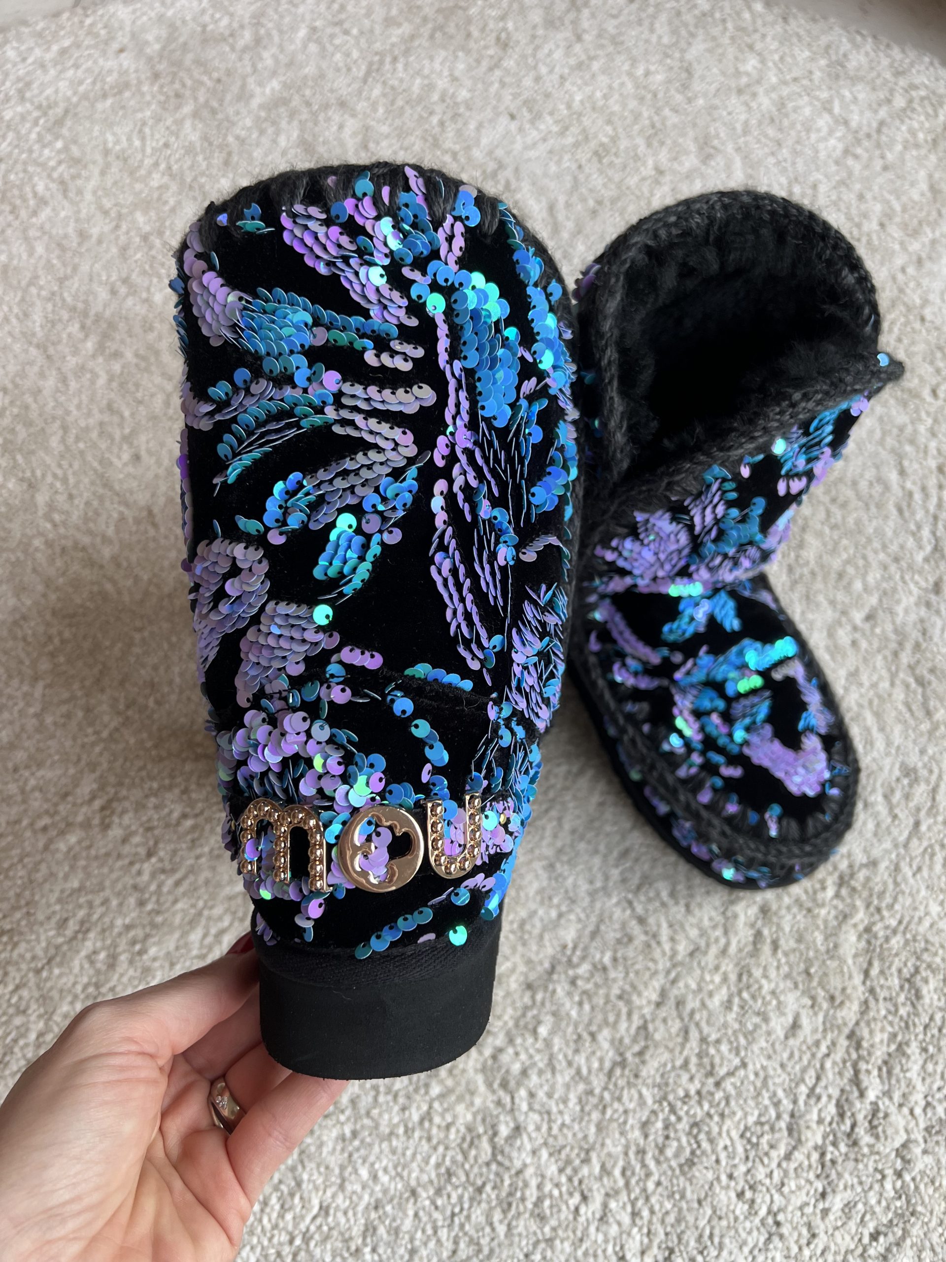 Favolose MOU in velluto e paillettes viola e turchese, interno pelo di montone nero.